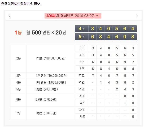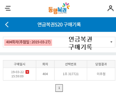 연금복권520 제404회차 당첨번호랑 비교해보니 꽝이군요.