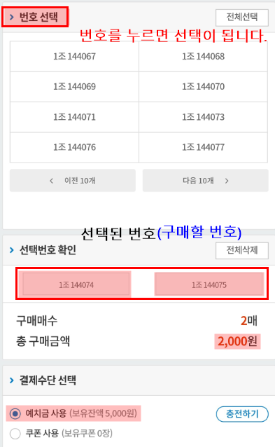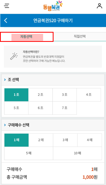 자동선택은 조와 구매매수만 선택해주면 됩니다.