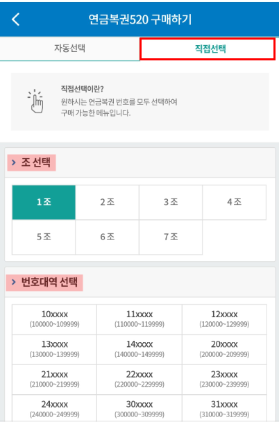 직접선택은 자신이 원하는 조와 번호대역 선택이 가능합니다.