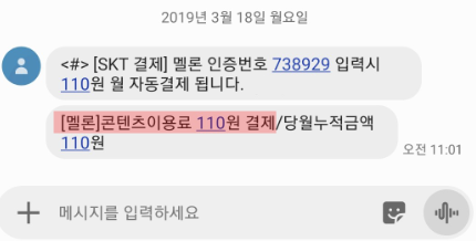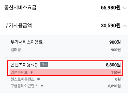 콘텐츠이용료에 "멜론콘텐츠" 항목으로 요금이 청구된 것을 확인할 수 있습니다.