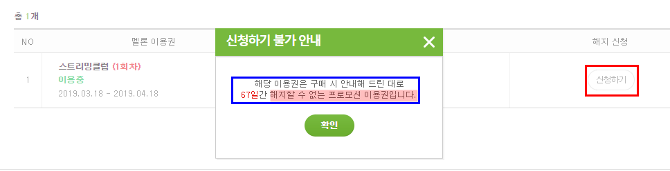4. (제일 중요) 셋째 달 결제일 7일 이후부터 해지신청이 가능합니다. (중도해지 불가)