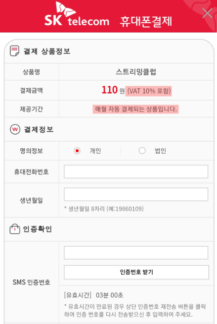 저는 결제 방법을 휴대폰 결제로 선택하여 진행했습니다.