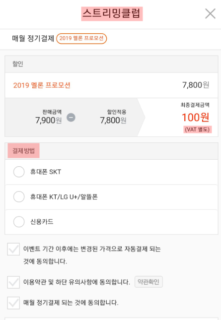 1. 일단 스트리밍클럽 첫 달, 둘째 달은 결제 금액이 100원(부가세 별도)이 맞습니다.
