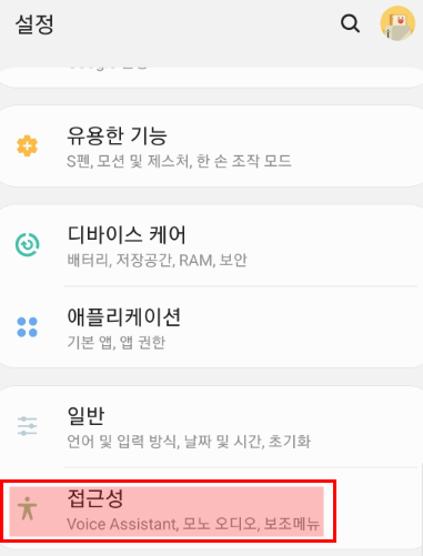 설정 창에서 "접근성"메뉴를 눌러줍니다.