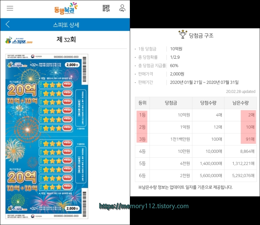 스피또2000 32회 출고율 및 남은 당첨 복권