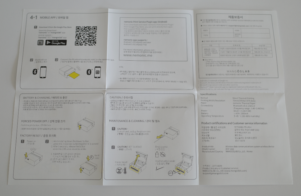 제품 보증서 부분을 읽어보니 네모닉 미니 품질 보증 기간은 1년이고 부품 보유 기간은 4년이라고 합니다.