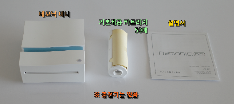박스 안에는 네모닉 미니 본품, 기본 제공 카트리지(옐로우 50매), 설명서