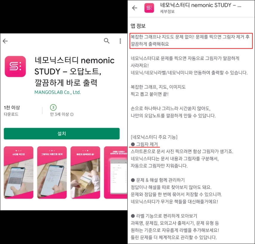 문제를 찍으면 그림자를 제거해 오답노트를 만들 수 있도록 도움을 주는 네모닉 스터디 앱도 있어요.