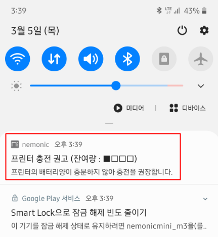 네모닉 미니에 배터리가 없다며 '프린터 충전 권고' 알림을 보내오네요.