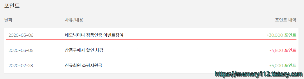 정품 인증 이벤트 참여 다음날 '네모닉미니 정품인증 이벤트참여'로 30,000 포인트가 들어왔습니다.