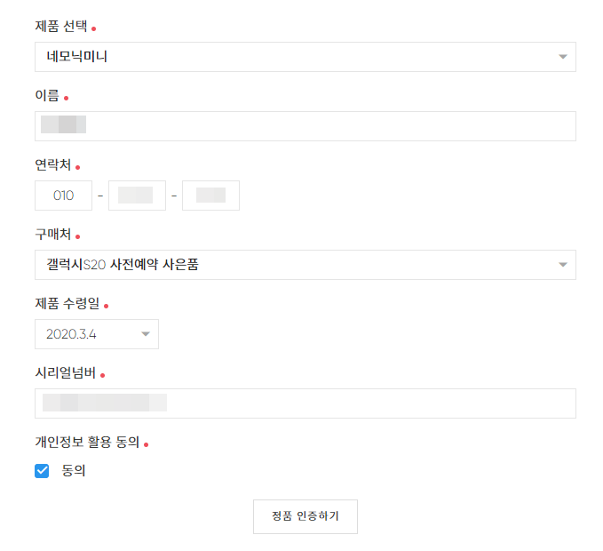 제품 선택, 이름, 연락처, 구매처, 제품 수령일, 시리얼넘버를 입력해줍니다.