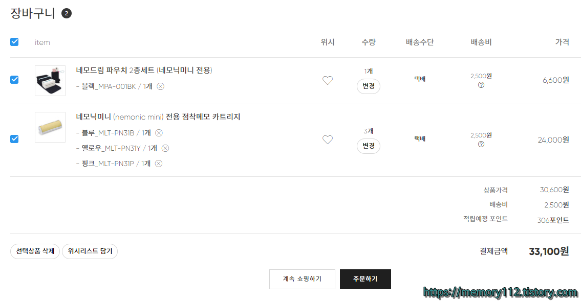 네모드림 파우치 2종세트와 네모닉 미니 카트리지 3개를 장바구니에 담았습니다.