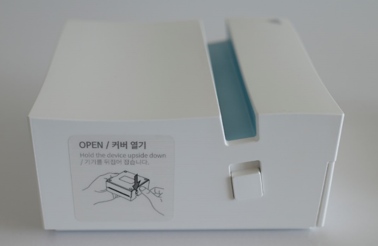 기기를 뒤집고 네모난 버튼을 밀어서 커버를 열어줍니다.