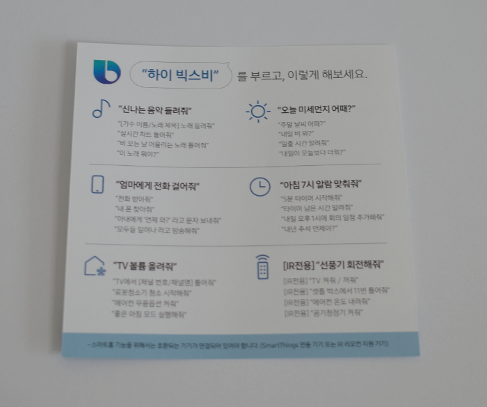 음악 재생(스트리밍 음원 사이트 연동), 날씨, 전화 걸기, 알람, IR 적외선 리모콘 명령 사용법 등이 적혀있다.