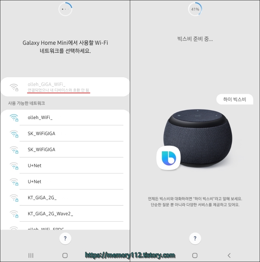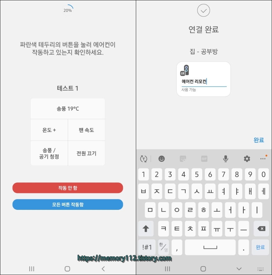 모든 버튼 작동함을 눌러주면 갤럭시 홈 미니와의 연결이 완료됩니다.