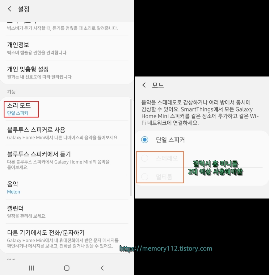 갤럭시 홈 미니는 다른 AI 스피커들과는 차별화된 스테레오 모드와 멀티룸 모드라는 것이 있다.