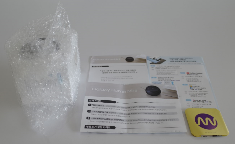 택배 박스 안에는 포장이 안전하게 잘 된 갤럭시 홈 미니, 설치 가이드 등이 있었다.