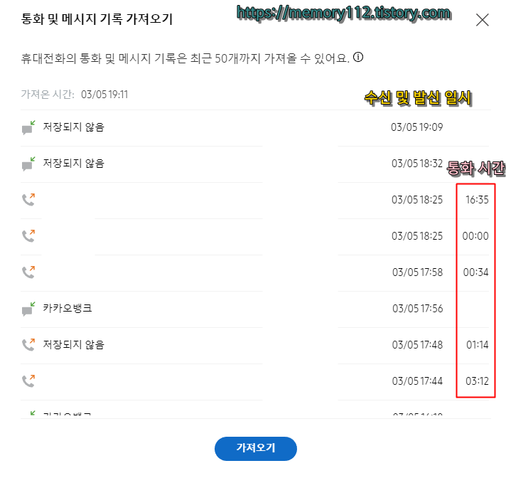 여기서 수신 및 발신자 번호, 수신 발신 일시, 통화 시간을 확인할 수 있습니다.