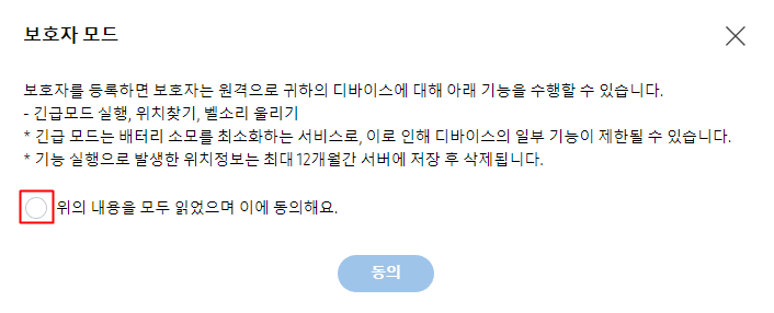 보호자가 이용할 수 있는 기능은 휴대전화 위치 확인, 긴급 모드 실행, 휴대전화 벨소리 울리기입니다.