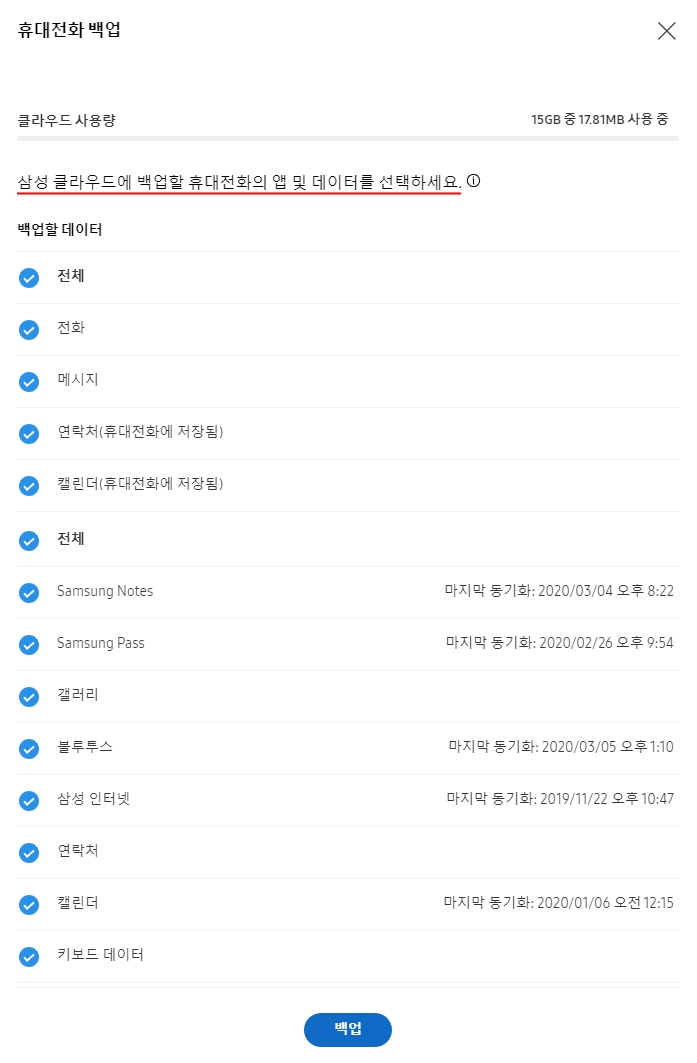백업 기능을 이용하면 휴대전화에 있는 데이터들을 삼성 클라우드에 백업시킬 수 있습니다.