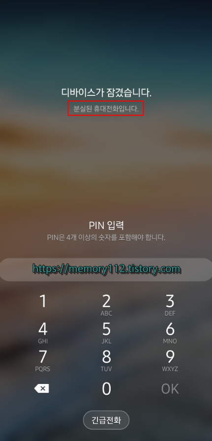 그리고 상단에는 '디바이스가 잠겼습니다.'와 '분실된 휴대전화입니다.(3단계)'라는 메시지가 표시되고,