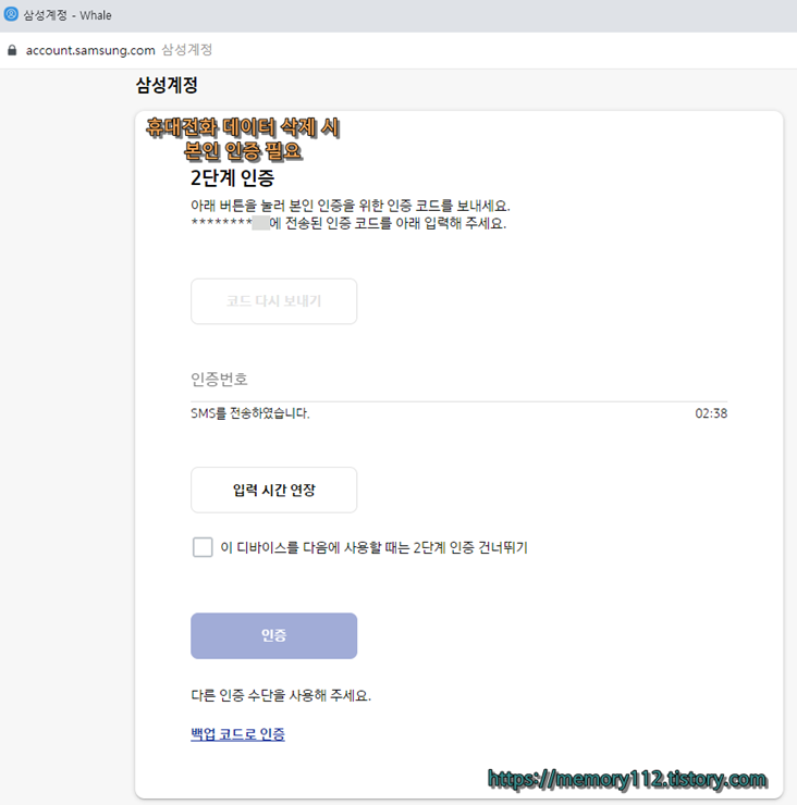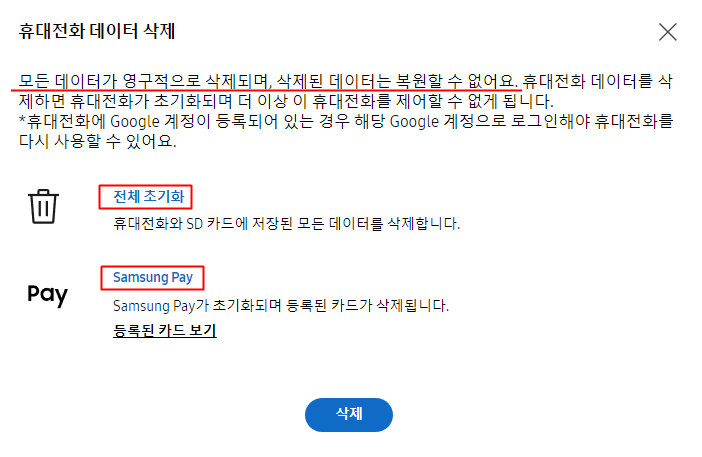 데이터 삭제 기능은 삼성 계정 로그인이 꼭 필요하네요.
