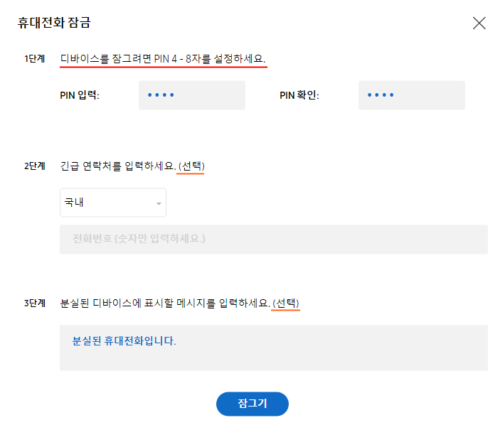 3단계 '분실된 디바이스에 표시할 메시지를 입력하세요.(선택)'을 입력하고 싶다면 입력해줍니다.