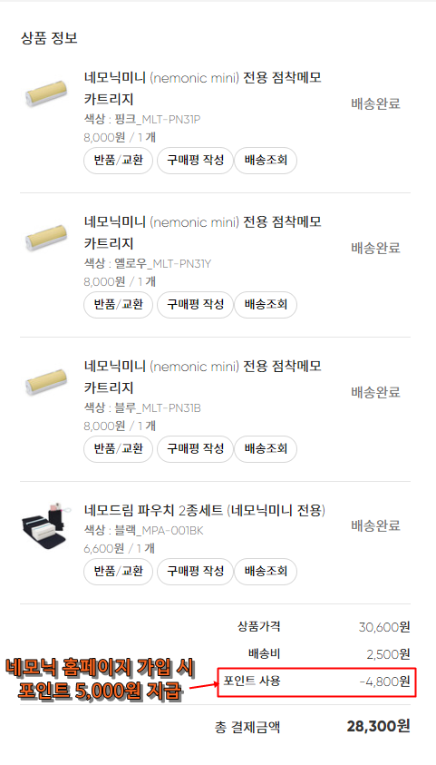 아무튼 네모닉 미니 홈페이지 신규 가입 시 주는 포인트 5,000원 중 4,800원을 사용해서