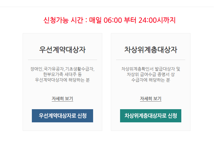 자격 기준은 우선 계약 대상자와 차상위 계층 대상자로 나누어집니다.