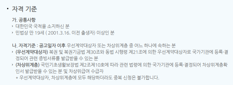 먼저 신청 자격 공통 사항은 대한민국 국적을 소지한 사람이고,