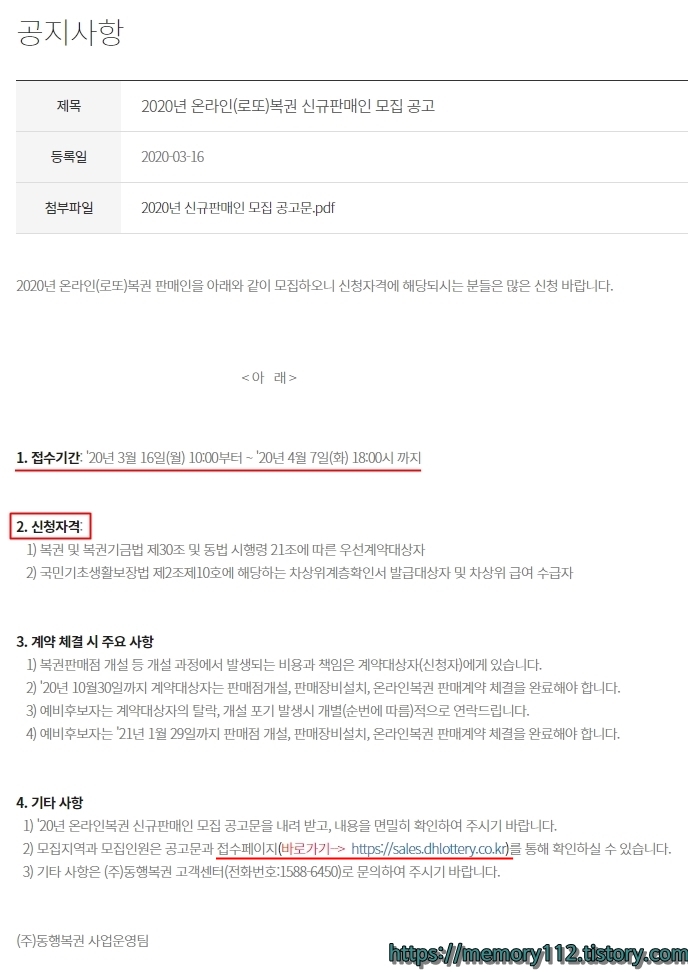 '2020년 온라인(로또)복권 신규판매인 모집 공고'라는 제목을 가진 글이 있는데요.