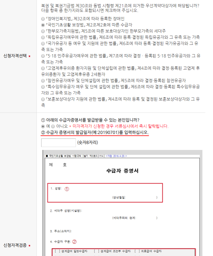 신청 자격 검증에서 수급자 증명서의 발급일자를 입력해줘야 합니다.