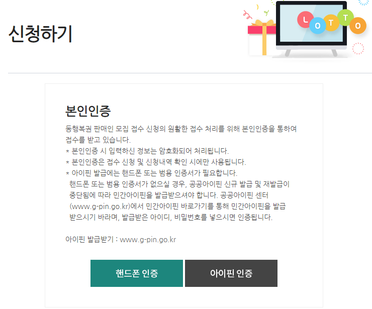 로또 판매인 신청을 위해선 본인 인증이 꼭 필요합니다.