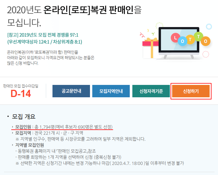 2020년에 모집하는 로또 판매인은 총 1,794명이며,