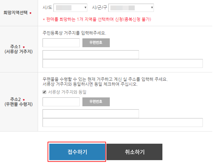 주민등록상 거주지 및 우편물 수령지 주소를 입력해줘야 합니다.