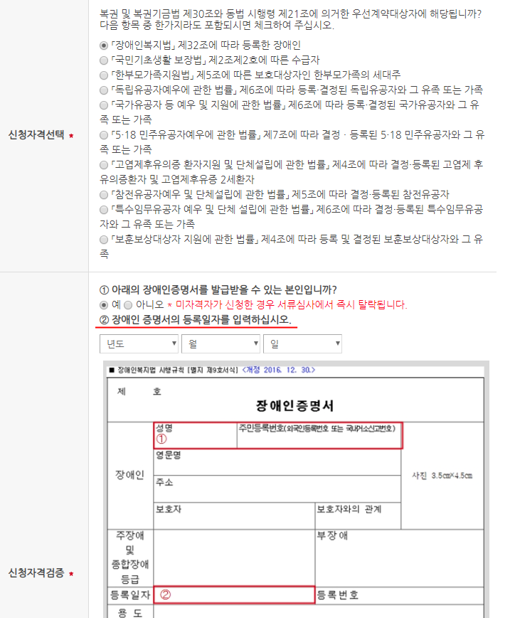 만약 신청 자격을 장애인으로 선택하셨다면