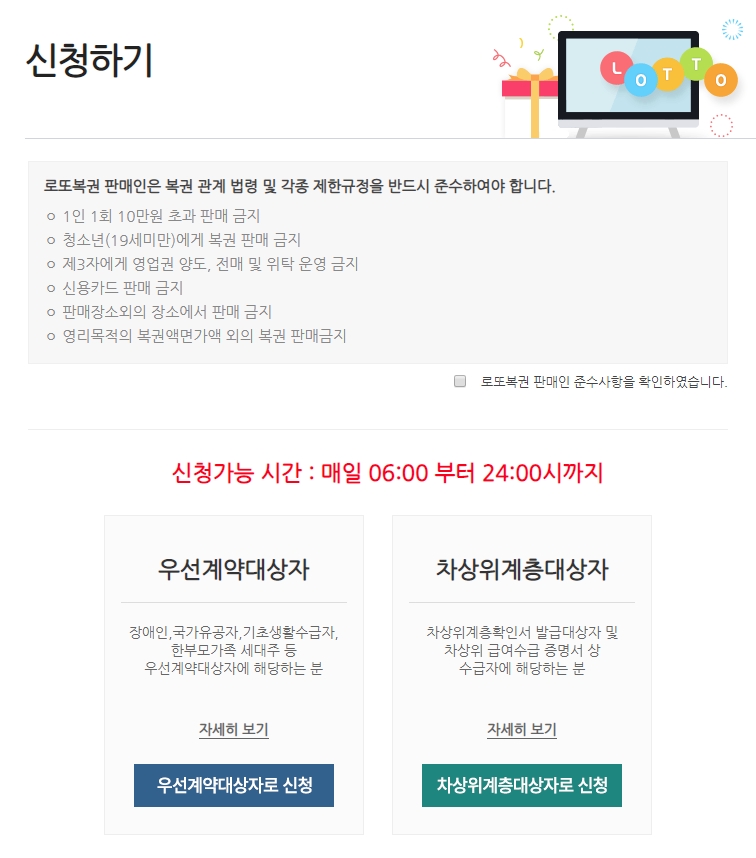 참고로 로또 판매인 신청 가능 시간은 매일 06시부터 24시까지입니다.