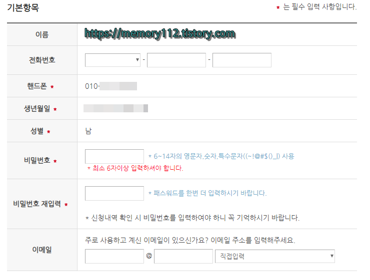 이어서 필수 입력 사항들(핸드폰, 생년월일, 비밀번호 등)을 입력해줍니다.
