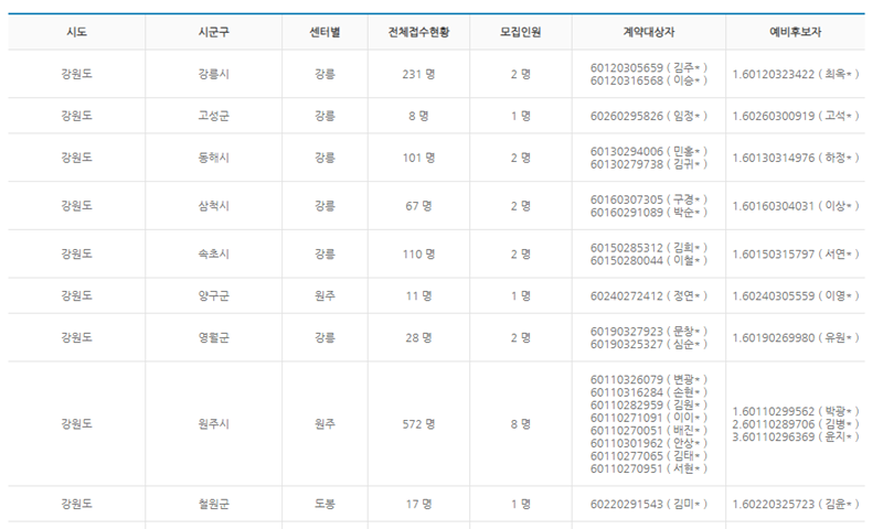 우선순위 계약자, 차상위계층 계약 대상자, 지역별로 당첨자를 확인할 수 있고,