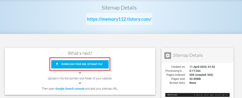 여기서 DOWNLOAD YOUR XML SITEMAP FILE 버튼을 눌러준다.