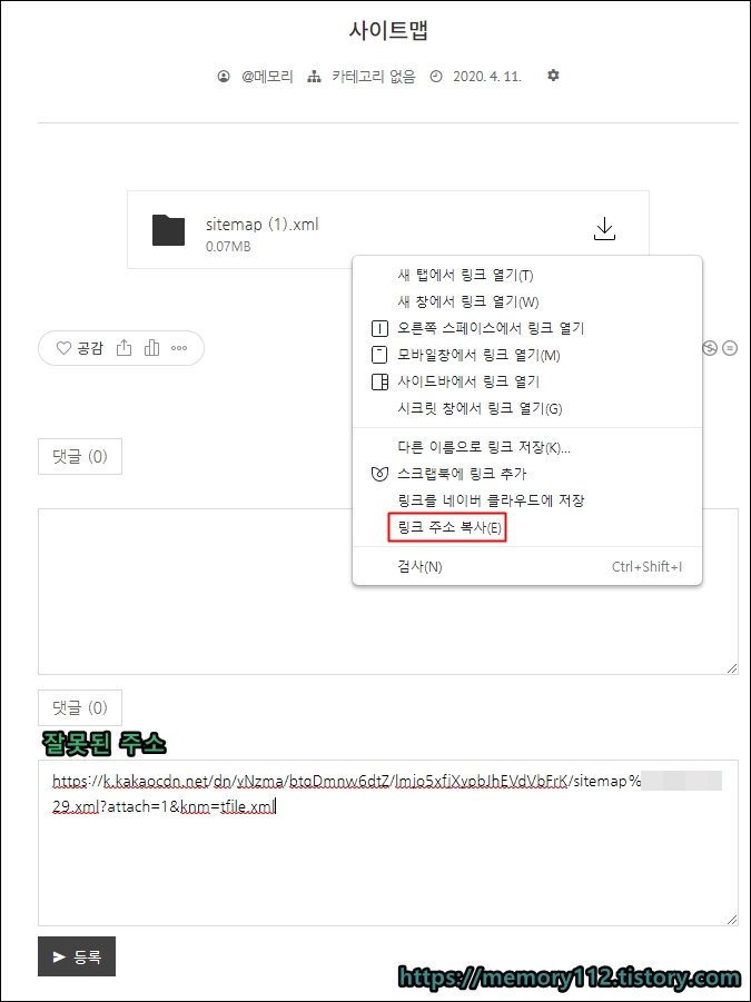 업로드된 파일에 마우스를 대고 링크 주소 복사(E) 버튼을 눌렀다.