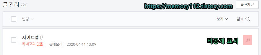 사이트맵을 업로드한 게시글이 비공개로 업로드 되었는지 확인한다.