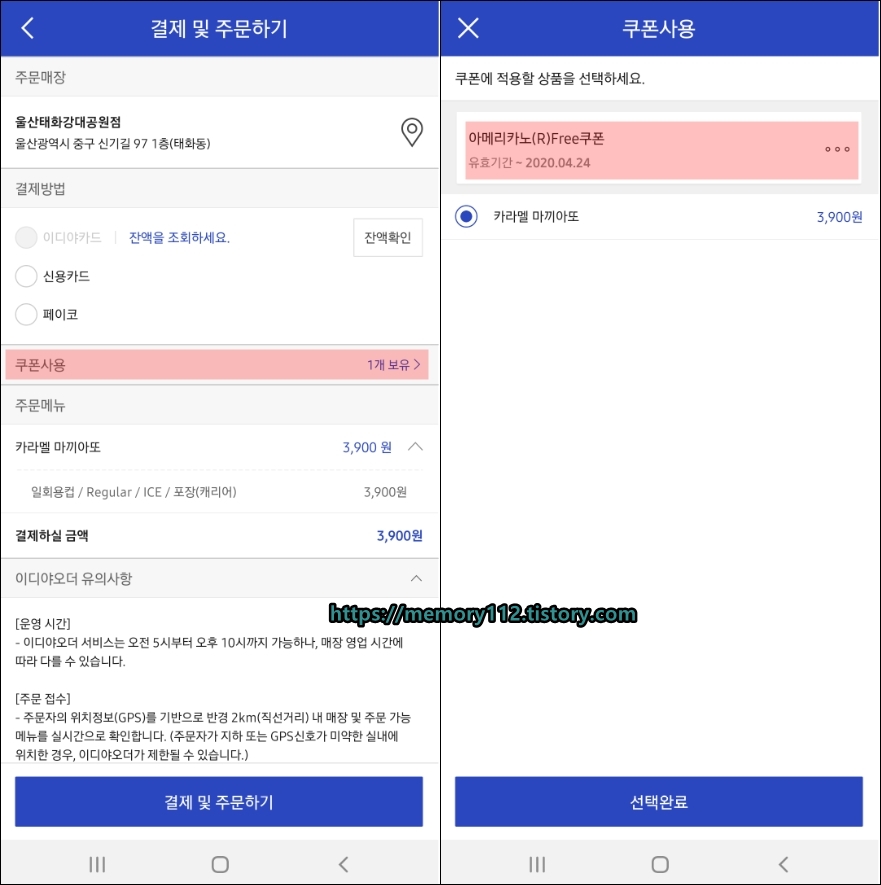 이디야 오더 주문 시 쿠폰 사용도 가능합니다.