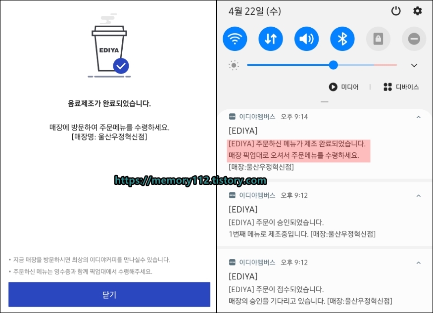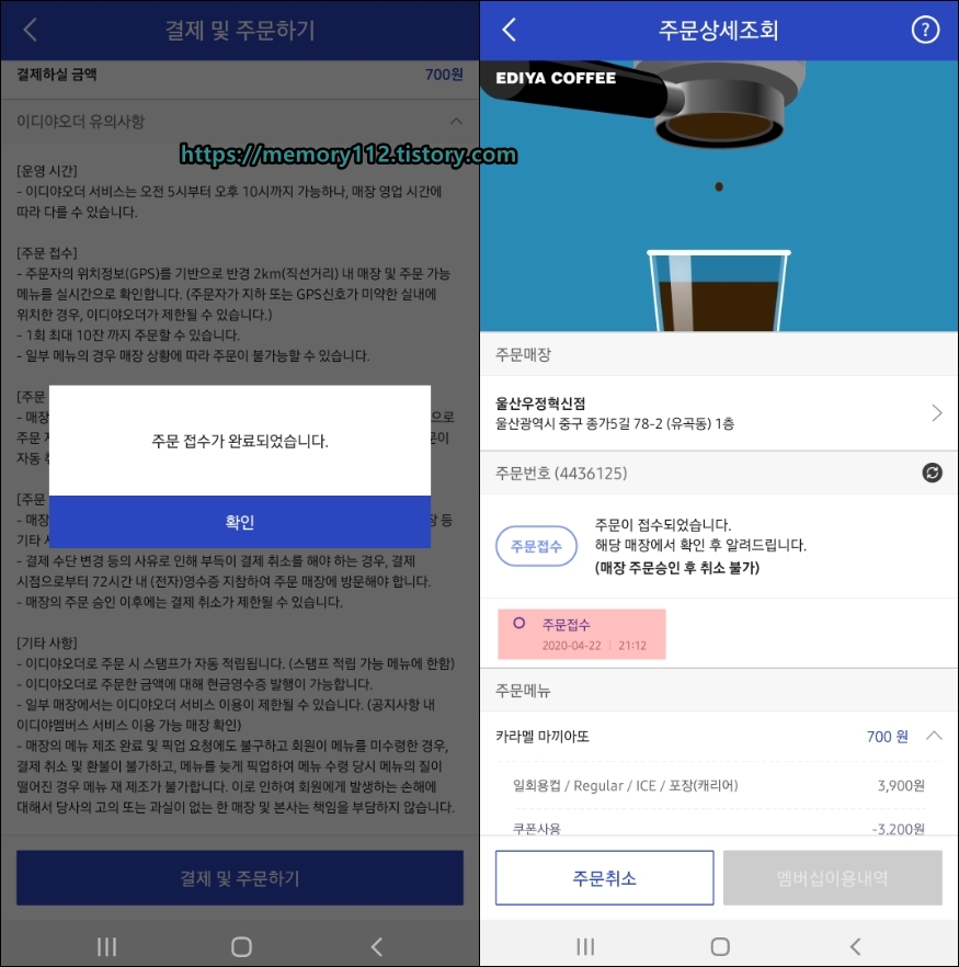 이디야 오더 주문 및 수령 어렵지 않았어요.
