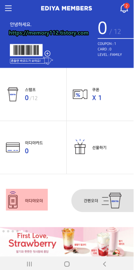 먼저 이디야 멤버스 앱을 설치 및 실행해줍니다.