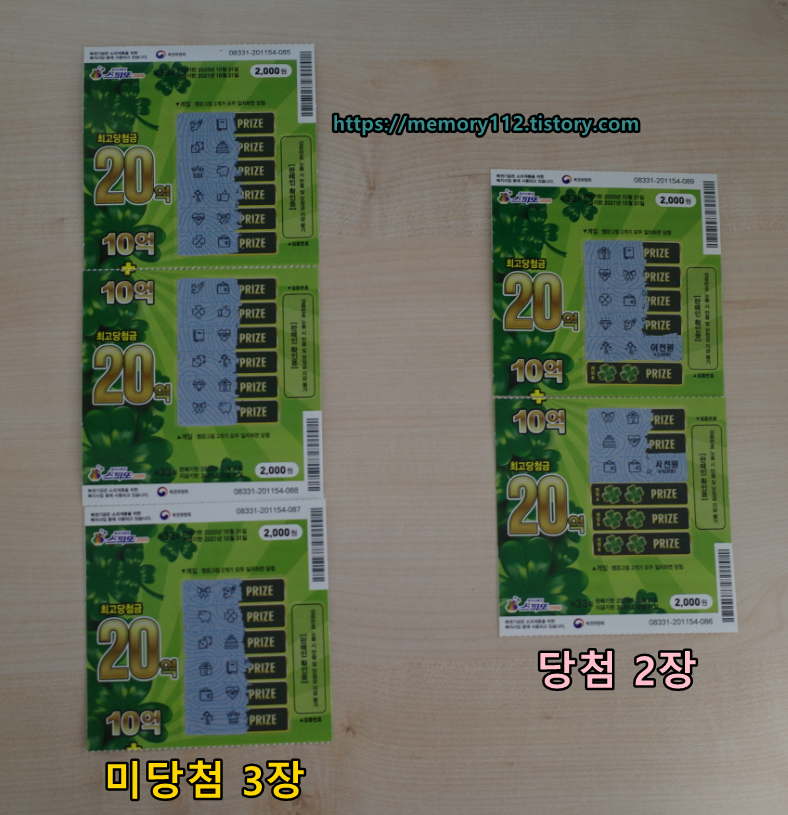 미당첨 복권 3장, 당첨 복권 2장이 나왔다.