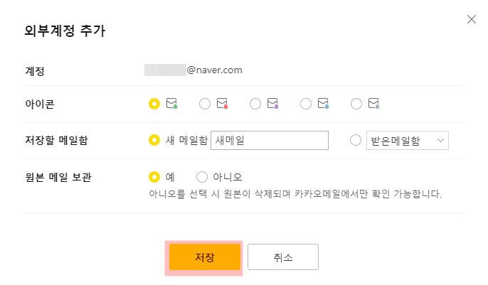 외부 계정 메일을 구분할 아이콘과 저장할 메일함을 설정해준다.