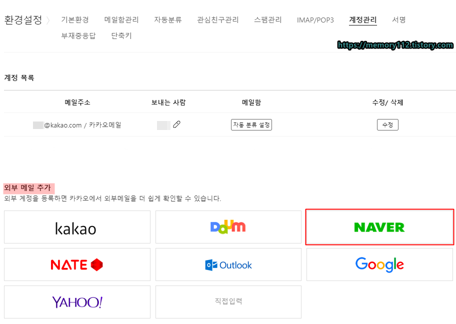 외부 메일(네이버, 다음, 구글 등) 가져오기 기능을 이용할 수 있게 되었다.