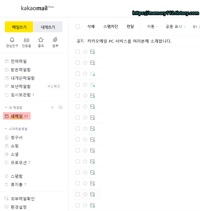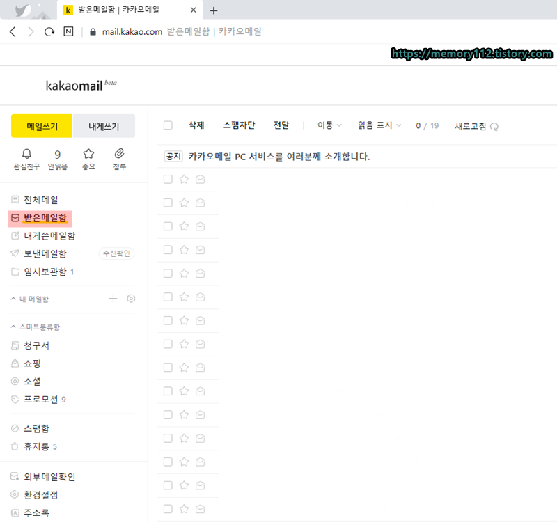 카카오 메일 메인 화면이다.