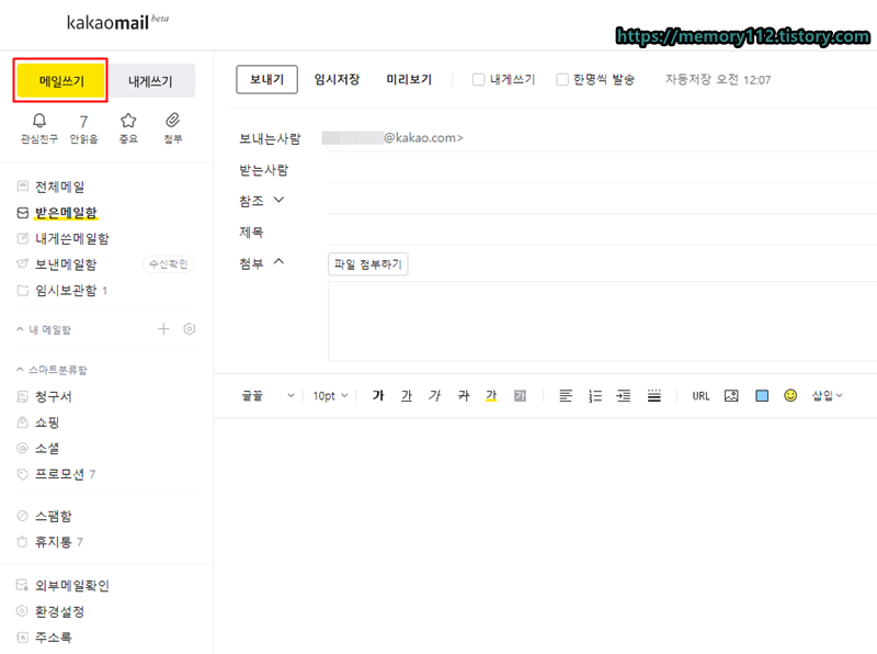 다른 메일들처럼 내게 쓰기, 파일 첨부, 자동 저장 등이 가능하다.